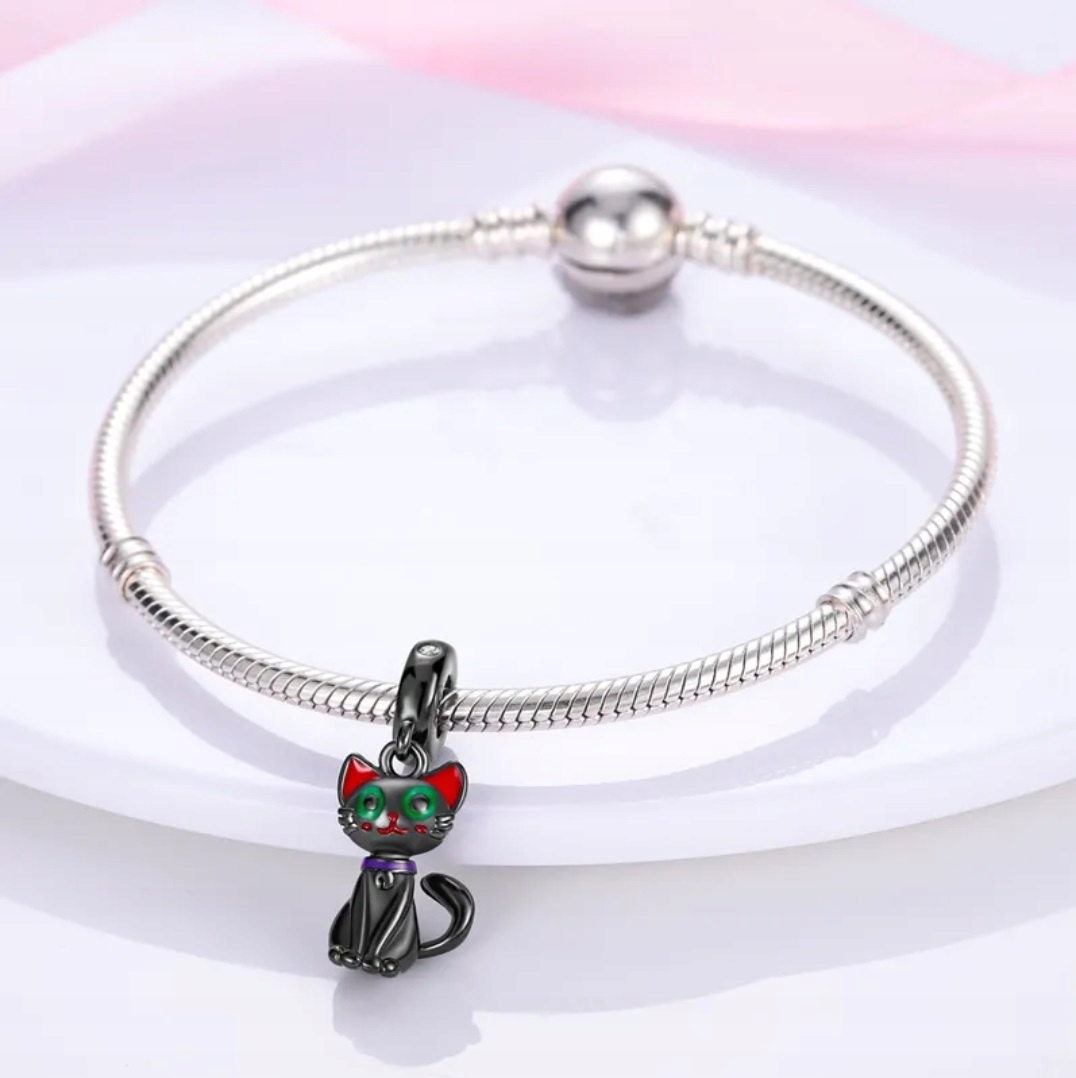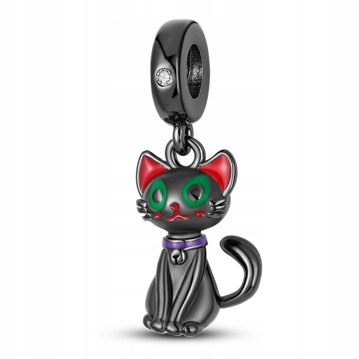 Charms przedstawia czarnego kotka z fioletową obrożą.
