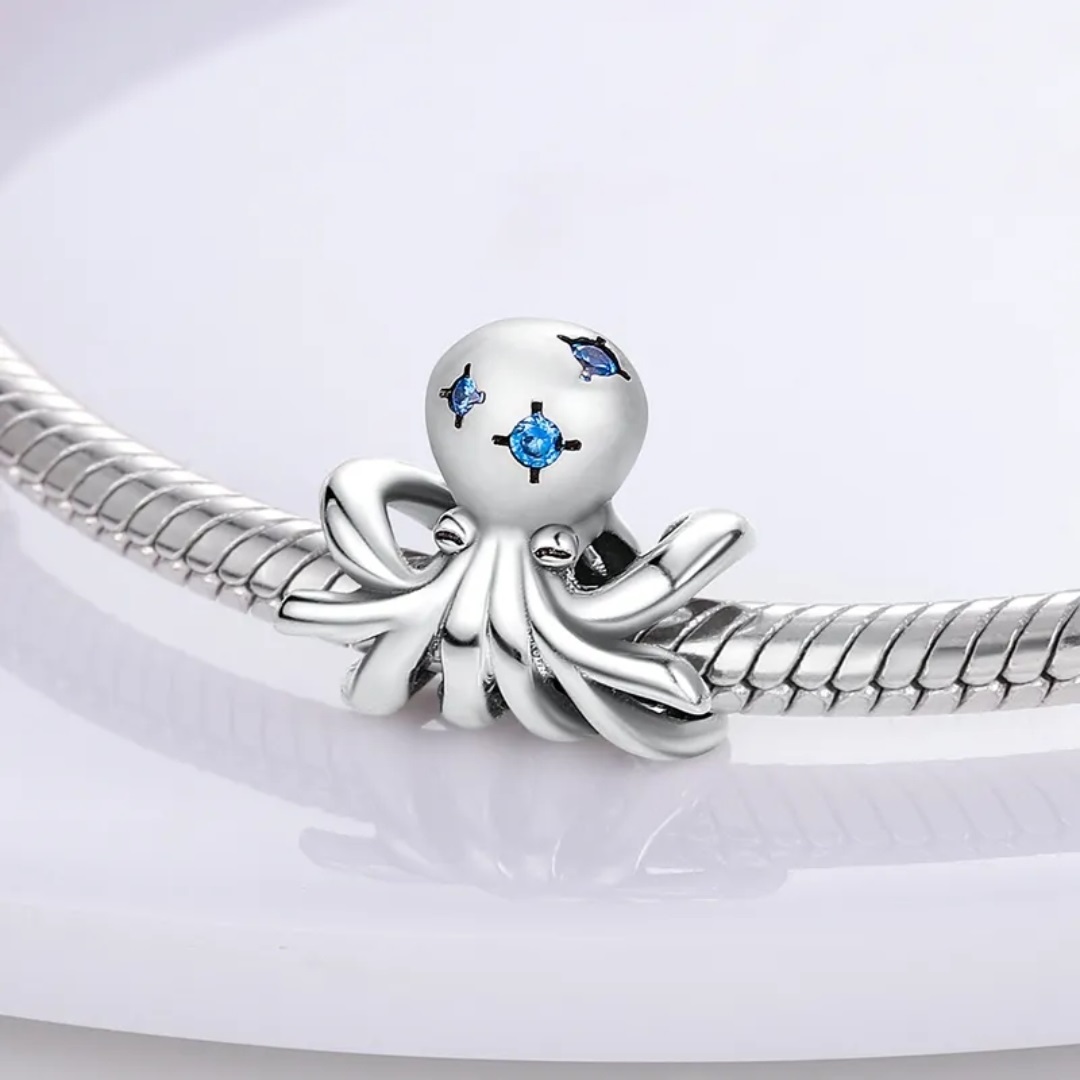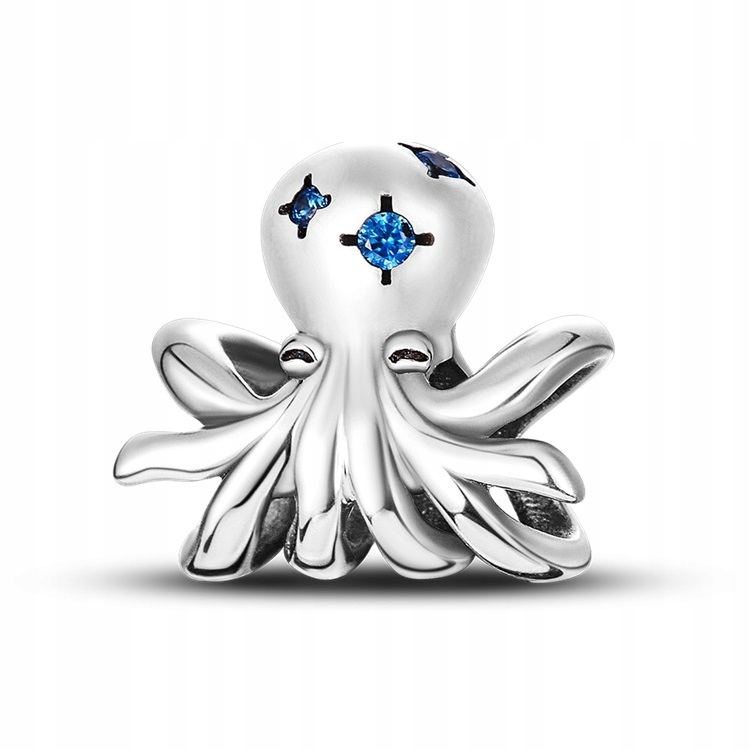 Charms przedstawiający ośmiornicę z niebieskimi cyrkoniami.