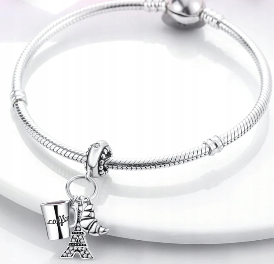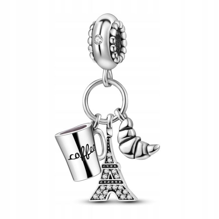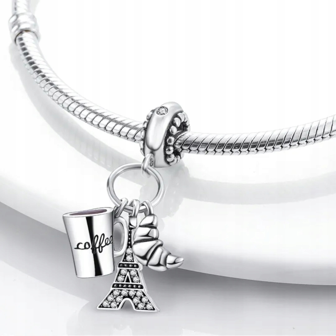 Zawieszka SREBRO 925 Charms Koralik Paryż Wieża Eiffla Rogalik Kawa